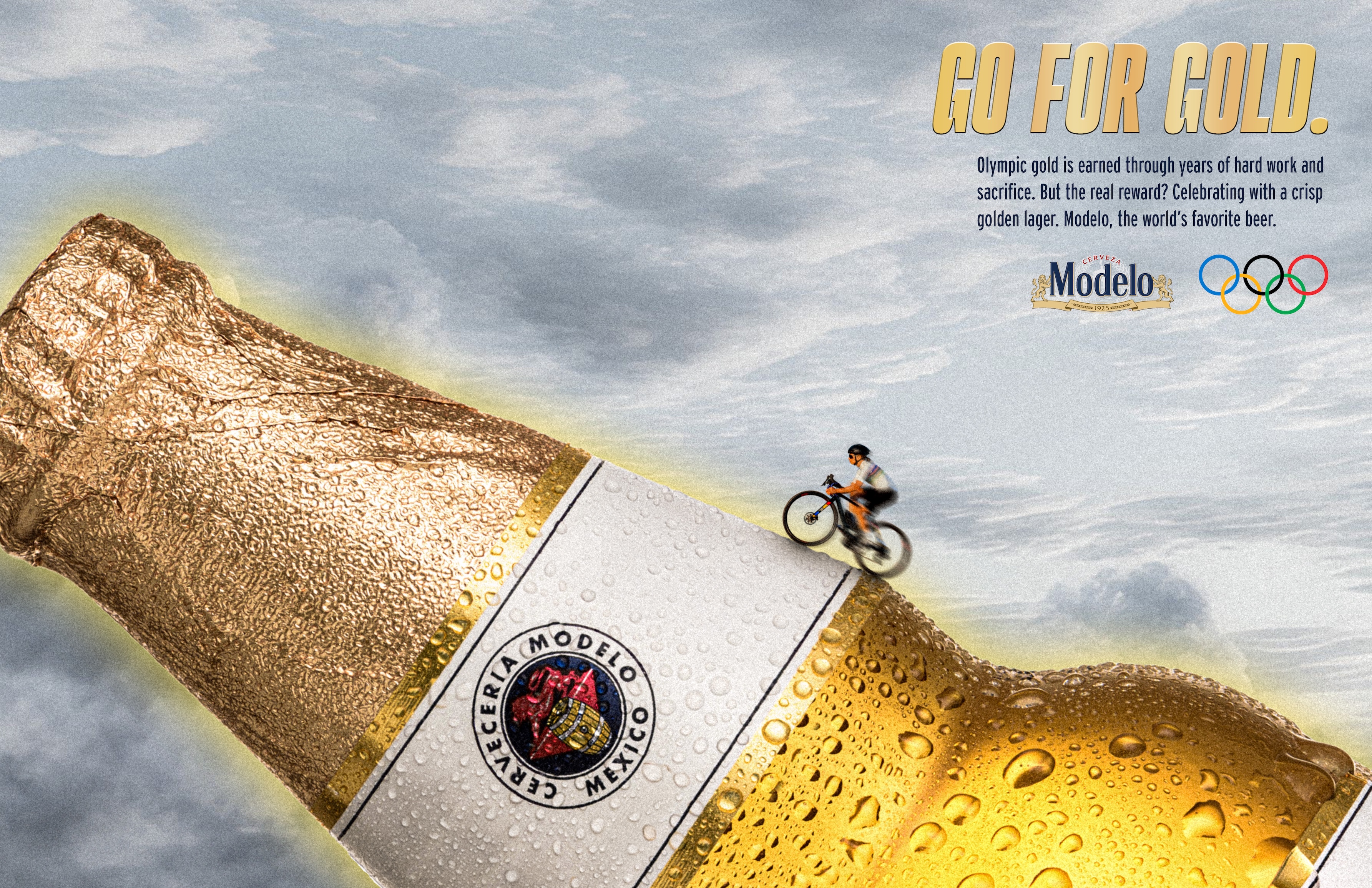 Olympic athletes in competition, striving toward the golden Modelo bottle, making the beer the gold the goal.